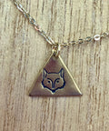 An adorable fox face stamped onto a brass triangle - a small, delicate, lovely piece of jewelry handmade by Peach Tree Lane.