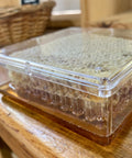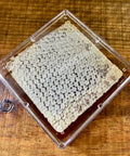 Every summer is spent in anticipation for the return of raw, local, fresh honeycomb! Packed full of this season's honey, a raw honeycomb provides a different flavor experience than honey on its own. The taste of wax and residual pollens impart a wild and aromatic quality to the fresh honey. You can either eat the wax (yes, beeswax is edible!) or spit out the leftover wad of wax once you're done chewing.